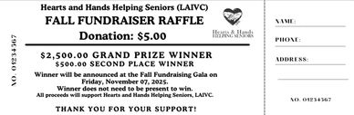 Be part of our Fall Fundraising Raffle supporting Hearts and Hands Helping Seniors — with a top prize of $2,500!